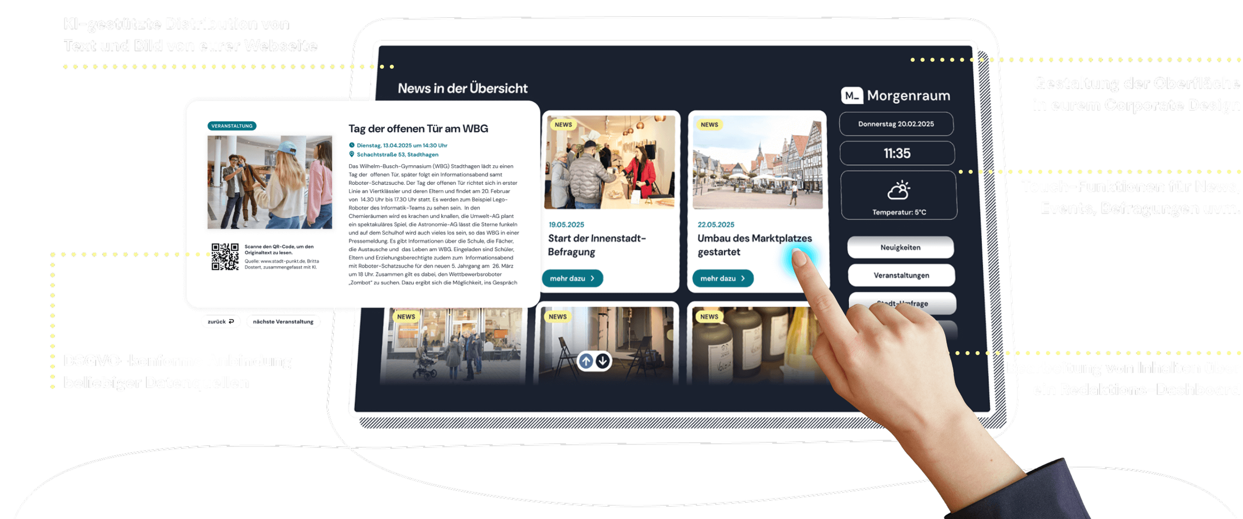 Aktuelle News, Veranstaltungen und Hinweise werden schnell und automatisch auf Touchpoints im kommunalen Raum sichtbar. Die KI-gestützte Software greift auf Inhalte aus vorgegebenen Datenquellen zurück, erkennt veraltete Informationen und spielt relevante Inhalte in Echtzeit aus.